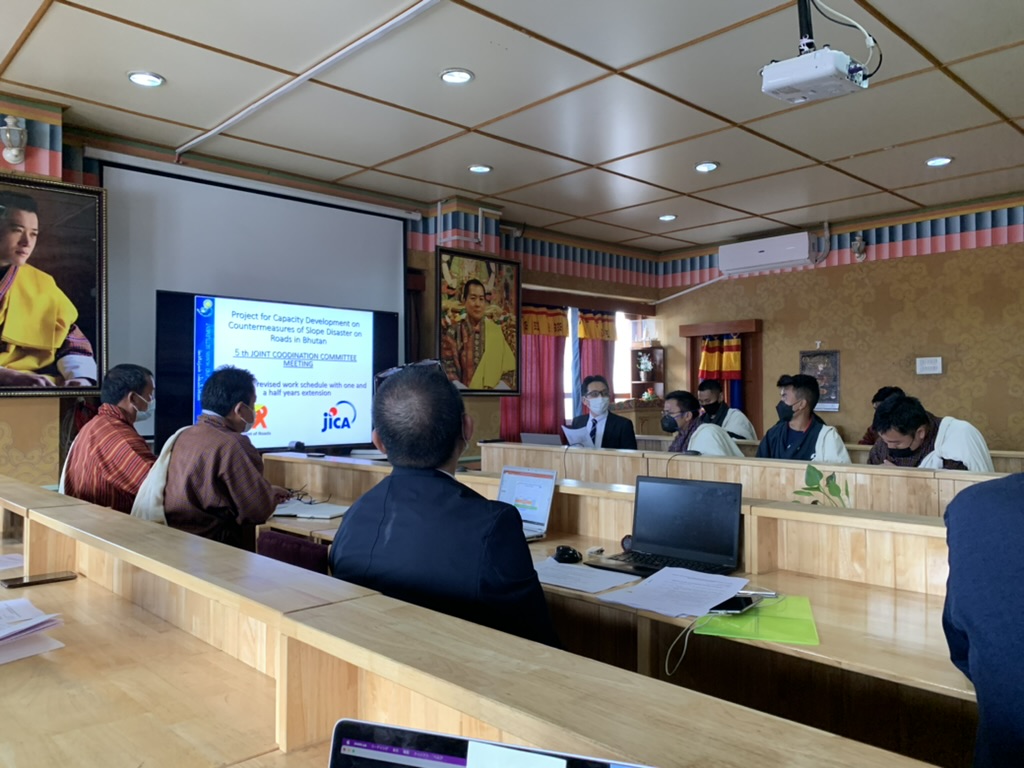 The 5th Joint Coordination Committee (JCC) meeting for the project “Capacity Development on Countermeasures of Slope Disaster on Roads in Bhutan” was held on 16 May 2022 in the MoWHS conference hall. The meeting was attended by officials from JICA Bhutan Office led by Chief Representative, JICA Expert Team, officials from DoR led by Director General and Policy and Planning Division, MoWHS. The meeting also had representation from JICA HQ, Tokyo and DoR officials from Lobesa and Trongsa Regional Office who attended the meeting virtually.