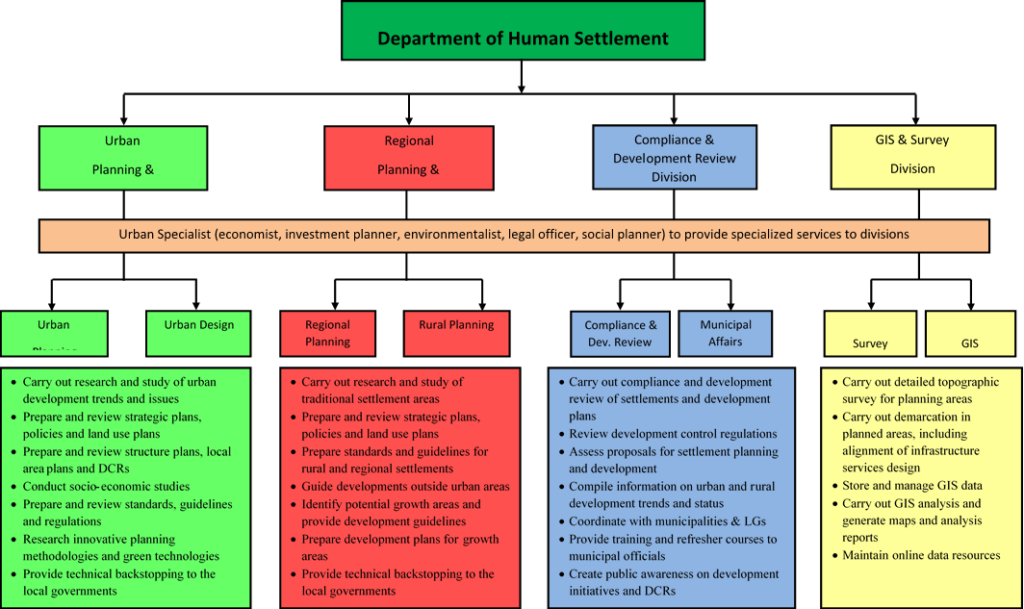 The rapid socio-economic development in the country placed immense demand on and for provision of infrastructure and develop-ment plans. In particular, the Department of Urban Development and Engineering Services, responsible for urban settlements and engineering services in the country was faced with increasing challenges. In addition to the complexity of urbanization, rapid changes were also taking place in villages and other settlements. On the other hand, there is increasing need for engineering services in the country and the technical support for local governments especially in view of the development focus of the 11th Five Year Plan. There-fore, to enable efficient delivery of services and to facilitate timely development, the Lhengye Zhungtshog approved the bifurcation of DUDES into the Department of Engineering Services and the Department of Human Settlement (DHS). This bifurcation enabled the two departments to specialize and focus more clearly on their respective areas of responsibilities.