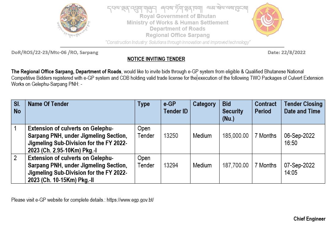 The Regional Office Sarpang, Department of Roads, would like to invite bids via e-GP system from eligible & Qualified Bhutanese National Competitive Bidders registered with e-GP system and CDB holding valid trade license for the execution of Culvert extension works along Gelephu-Sarpang PNH (2.95-10Km) Pkg-I [ e-GP Tender ID no. 13250] and Pkg-II (10-15km) [e-GP Tender ID 13294]