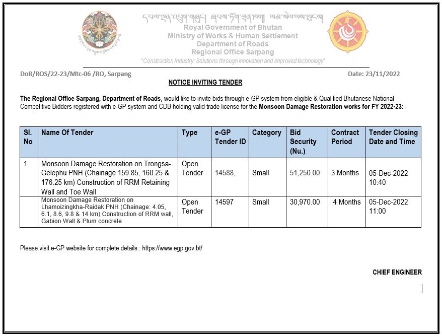 NIT: The Regional Office Sarpang, Department of Roads, would like to invite bids through e-GP system from eligible & Qualified Bhutanese National Competitive Bidders registered with e-GP system and CDB holding valid trade license for the Monsoon Damage Restoration works for FY 2022-23