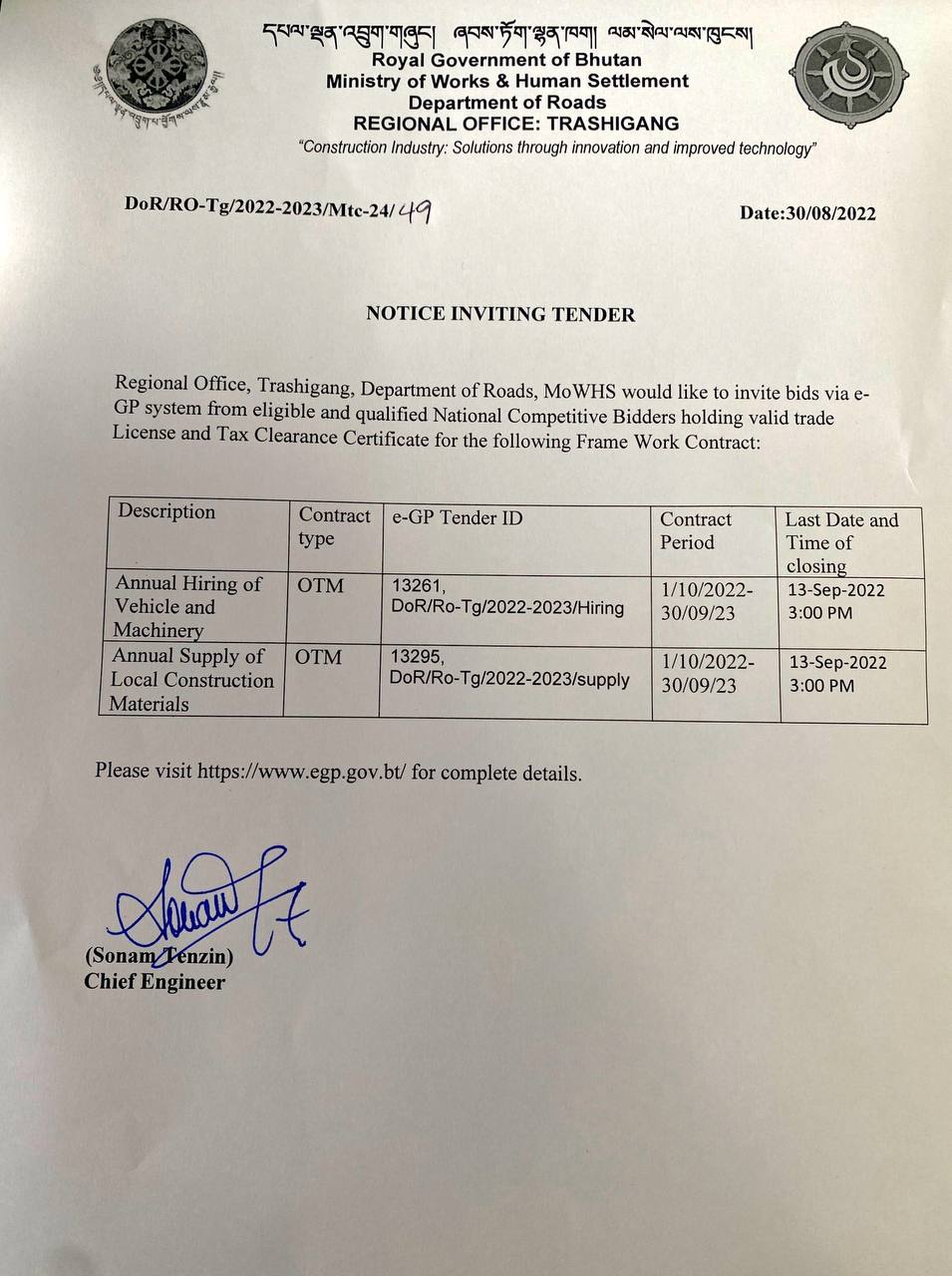 The Regional Office, Trashigang, DoR would like to invite bids via the e-GP system from eligible and qualified National Competitive Bidders with a valid Trade License and Tax Clearance Certificate for the following framework contract; http://moit.wonstechnology.com/wp-content/uploads/2022/08/NIT-1.jpg